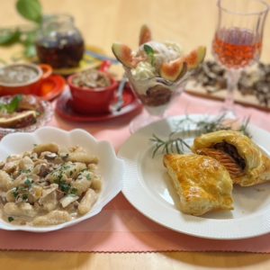 ●きのこ麹とディルでマリネしたサーモンとドライきのこのパイ包み●無花果とチョコのパルフェ仕立て