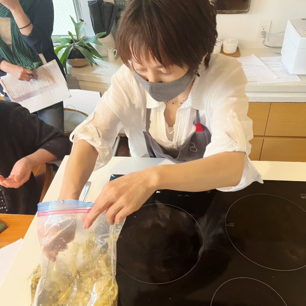 私からは、発酵、麹についての講義と玉ねぎ麹・野菜麹・きのこ麹・塩レモンの作り方実演と使い方と、それぞれのテイスティングなど。
